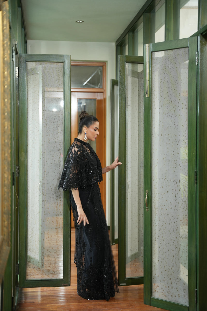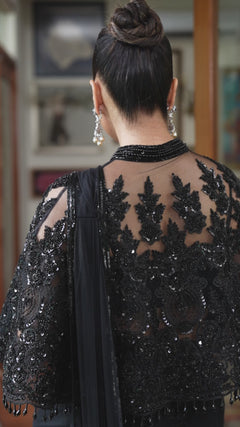Striking and sophisticated, this black stitched sari is paired with a hand-embroidered cape adorned with tonal crystals, beads, and sequins. A play of texture and light, it exudes quiet power and evening allure.