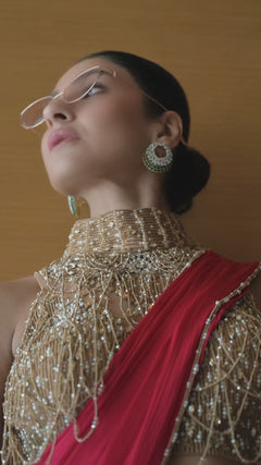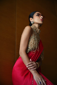 A contemporary silhouette in vivid fuchsia, this stitched sari is paired with a high-collar halter blouse intricately hand-embellished with chains, Swarovski crystals, cut beads, and pearls. A statement in modern glamour, it shimmers with every movement—bold, sculptural, and undeniably elegant.