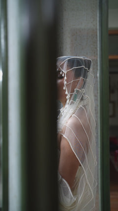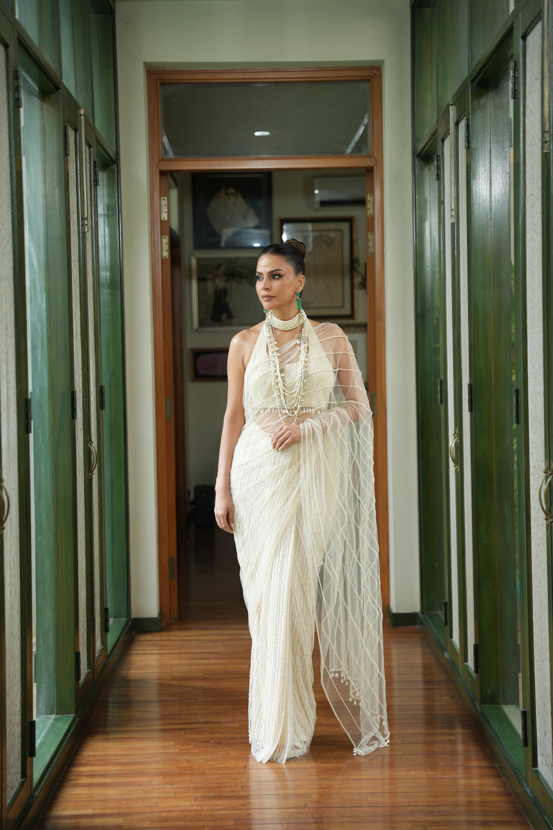 Elegant and ethereal, this ivory sari is paired with a concept halter blouse adorned with cascading pearl chains, crystals, and cut beads. A luminous expression of modern grace, it captures light and movement in perfect harmony.