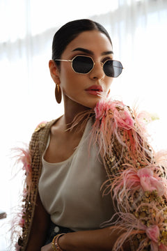 A playful yet powerful ensemble, the metallic coin jacket and pencil skirt shimmer with sculpted ease. Versatile and modern, this set can be styled in multiple ways—offering endless possibilities for statement dressing