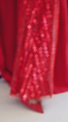 Dramatic yet refined, this asymmetric cape in Valentino red features ethereal feather cuffs that add movement and allure. Worn over tonal embellished pants, it’s a striking balance of structure and softness—made for moments that command attention.
